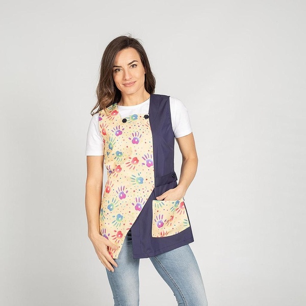 Casulla tipo estola, con un bolsillo central, pinzas en la espalda, tirantes regulables con hebilla y botón y tiras laterales para anudar.