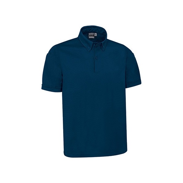 Polo de manga corta entallado. Cuello y ribete de mangas en canalé 1×1 con detalle en relieve. Tapeta con 3 botones. Cubrecosturas reforzado en cuello. Aperturas laterales y bolsillo opcional.